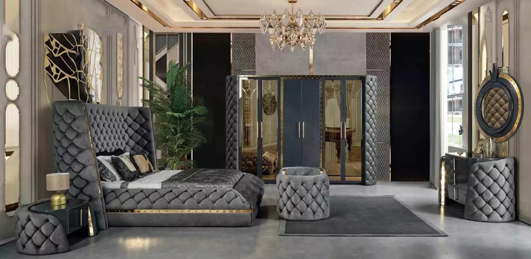 Das Chesterfield Schlafzimmer Set bietet ein elegantes und luxuriöses Design, das Ihr Schlafzimmer in eine stilvolle Oase verwandelt. Das Set umfasst ein imposantes Bett mit den Maßen ca. 200 x 213 x 158 cm und einer großzügigen Liegefläche von ca. 180 x 200 cm. Zwei passende Nachttische mit den Maßen ca. 70 x 45 x 86 cm bieten praktischen Stauraum, während der Schminktisch mit den Maßen ca. 157 x 70 x 85 cm ein glamouröses Ambiente schafft. Der geräumige Kleiderschrank mit ca. 315 x 82 x 240 cm bietet ausreichend Platz für Ihre Kleidung und Accessoires. Die Bank mit den Maßen ca. 110 x 70 x 85 cm rundet das Set perfekt ab.