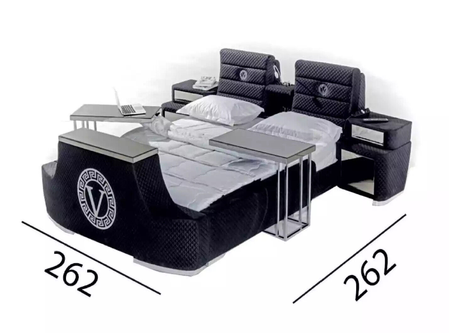 Erleben Sie Luxus und Eleganz mit unserem modernen Doppelbett in Blau von XL Moebel! Das Doppelbett besticht durch sein modernes Design und das luxuriöse Bettgestell. Die Maße von ca. 262 x 262 x 100 cm bieten Ihnen ausreichend Platz zum Entspannen. Mit einer Liegefläche von 200 x 200 cm sorgt das Bett für erholsame Nächte. Das Highlight dieses Bettes ist der Lift im Fußbereich, der Platz für einen TV-Fernseher bietet. So können Sie gemütlich fernsehen und sich verwöhnen lassen. Die zwei Nachttische in der Farbe wie abgebildet runden das Ensemble perfekt ab. Hergestellt aus hochwertigem Holz und Textil, überzeugt dieses Doppelbett in jeder Hinsicht. Gestalten Sie Ihr Schlafzimmer mit Stil und Komfort - bestellen Sie jetzt unser modernes Doppelbett in Blau!